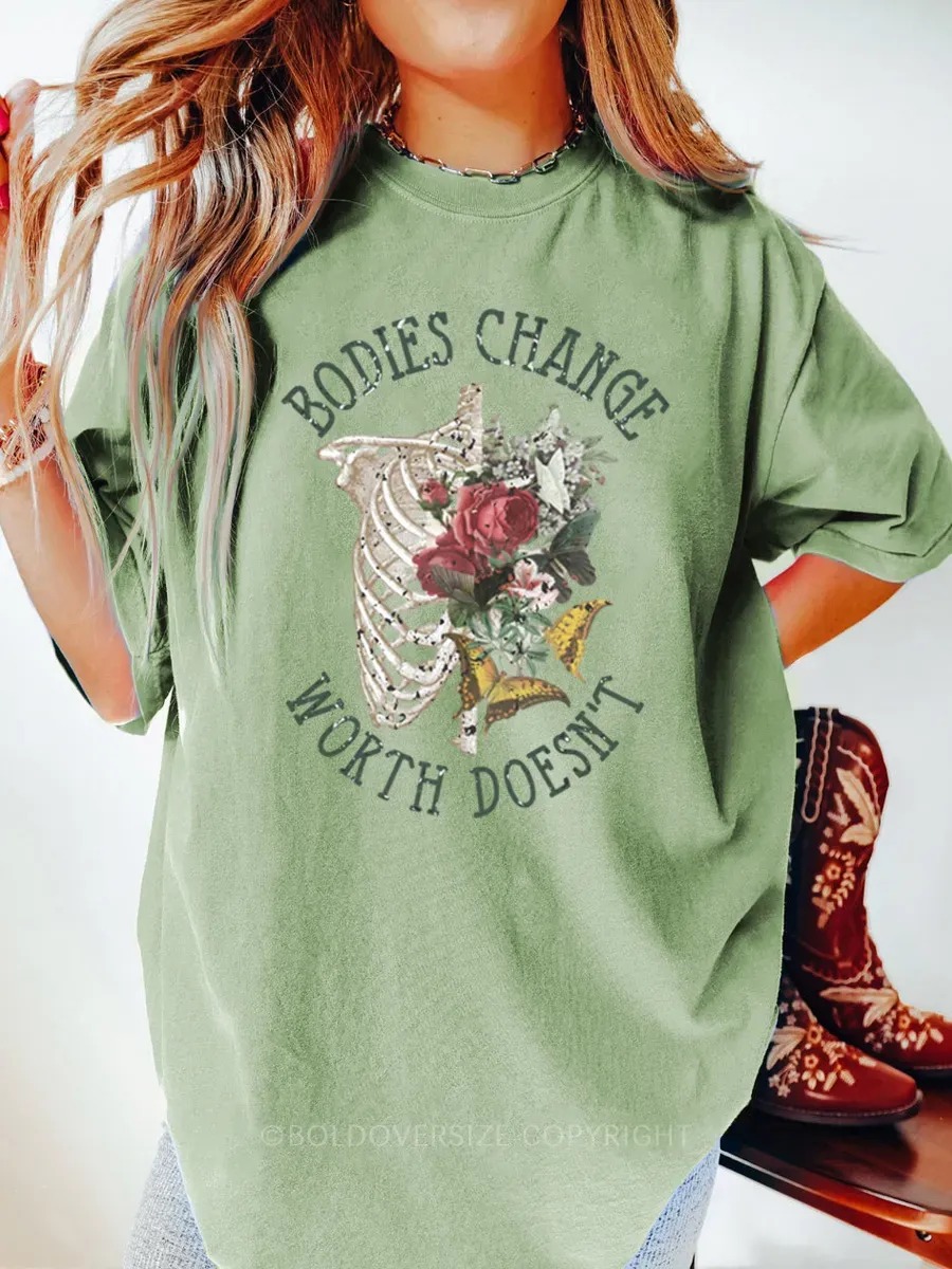 What’s better than a shirt that combines flower power and skeleton chic? This shirt has it all, with a bold skeleton design wrapped in delicate roses, paired with the empowering statement: “Bodies Change, Worth Doesn’t.” Talk about a confidence booster wrapped in the most stylish package! The mix of edgy skeleton bones and soft florals represents the perfect balance of strength and softness, ideal for a bold woman who embraces who she is.