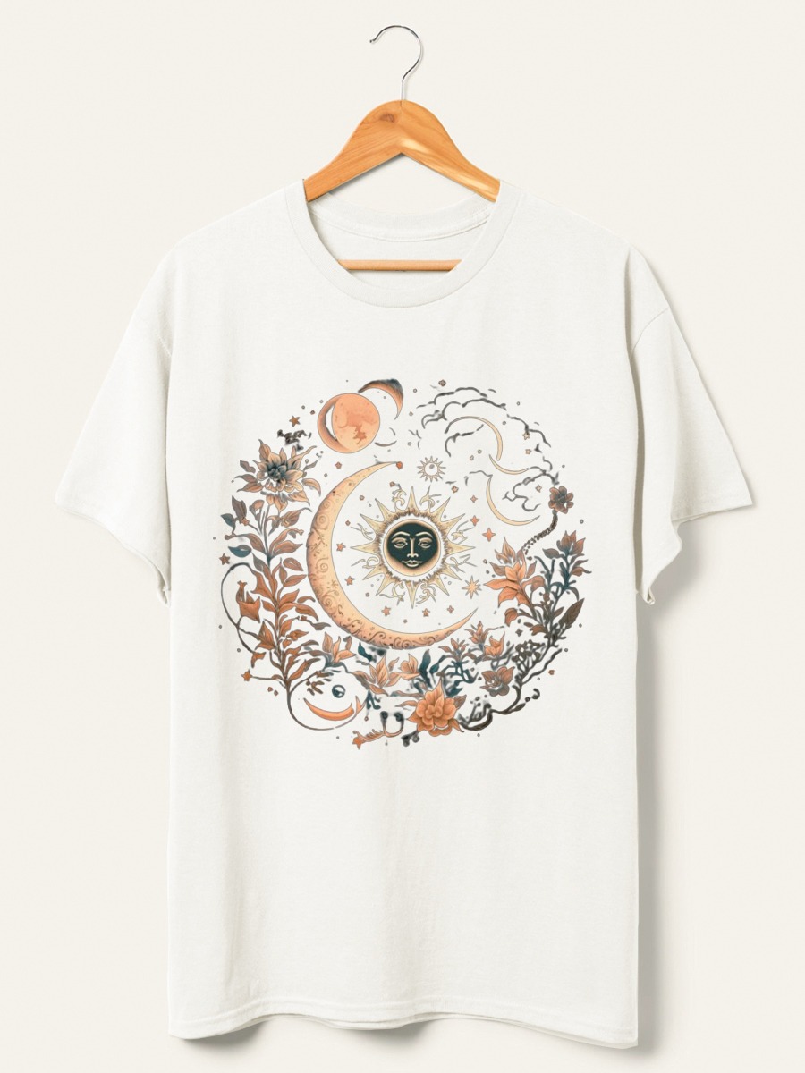 First up, we have this dreamy celestial beauty—a t-shirt featuring a stunning moon and sun design. If you're a fan of astrology or just love the cosmic vibes, this is the perfect tee for you. It has an intricate design of floral elements surrounding the sun and moon, painted in earthy tones that scream “I’m cool but still down to earth.” The vintage, hand-drawn vibe of the art gives this shirt a boho-chic feel, while the lightweight fabric ensures it’s comfy for those hot summer days.
