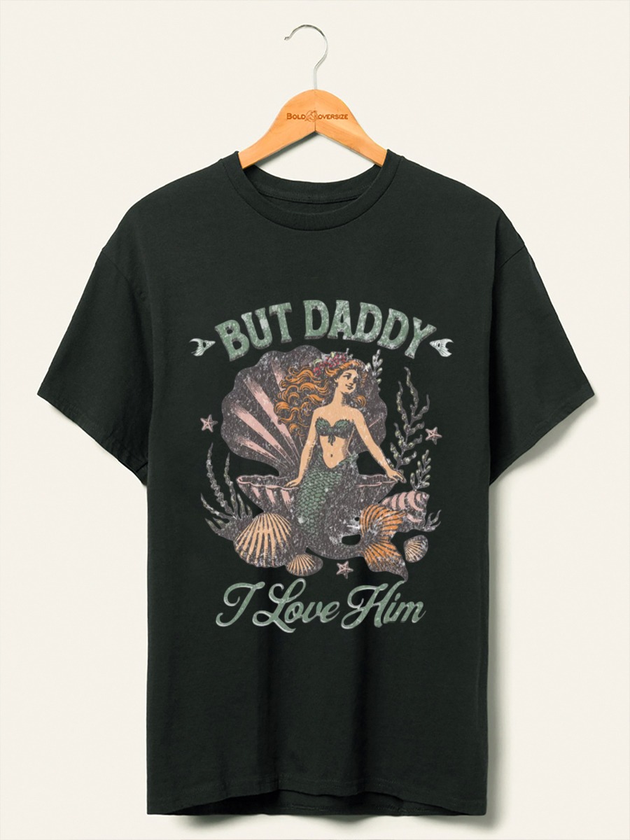 Next on the list is a fun and whimsical design that features a vintage-style mermaid with a playful phrase: “But Daddy, I Love Him.” This t-shirt is absolutely perfect for all the mermaid lovers or anyone who enjoys a good dose of humor with their style. With a retro font and a mermaid sitting gracefully on a shell, surrounded by seashells and ocean details, it’s a nostalgic piece that makes a bold statement.