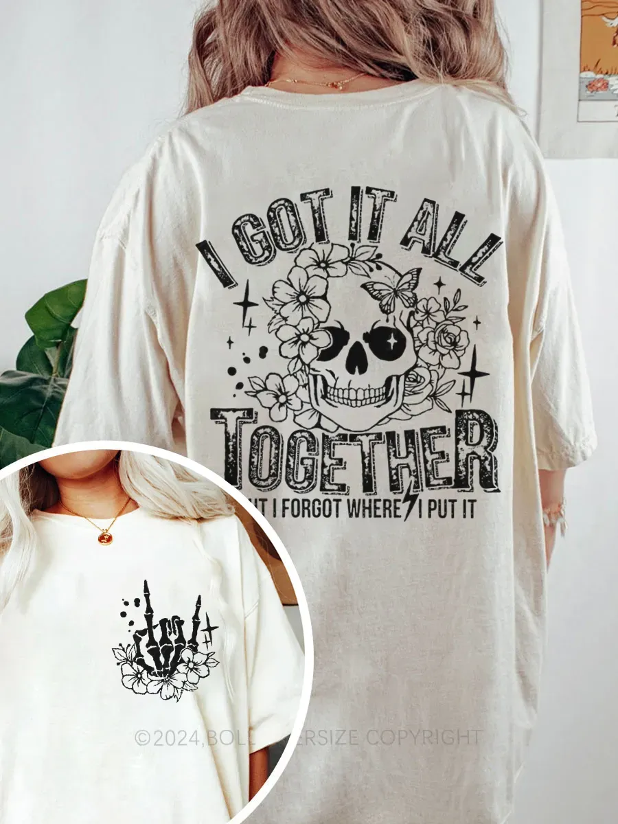 On the back of the shirt, you’ll find a grinning skeleton surrounded by whimsical floral accents and sparkling stars. The bold text reads, “I Got It All Together (I Just Don’t Know Where I Put It),” which is the perfect mantra for anyone who’s ever felt like they’re juggling life with one hand tied behind their back. It’s snarky, relatable, and just the right amount of edgy.
