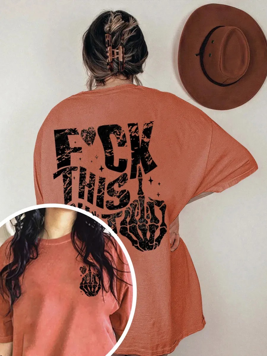 This rust-colored oversized tee is a fiery mood all on its own. With bold typography and a skeleton hand flipping the bird, it’s the ultimate expression of frustration with a side of rebellious charm.