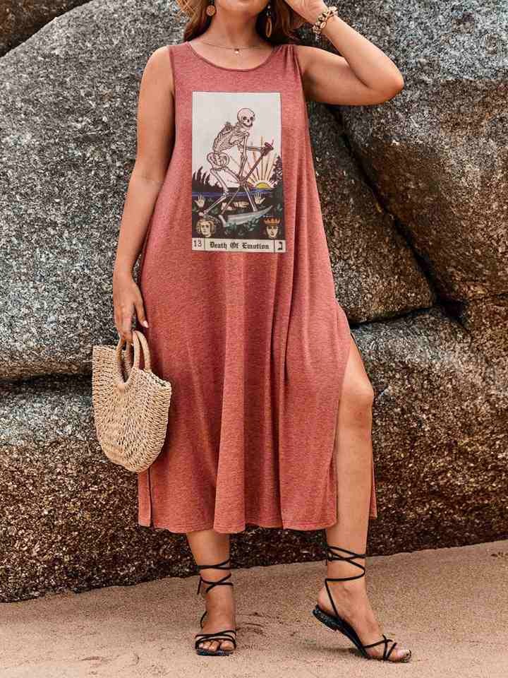 Vintage Sun And Moom Graphic Split Thigh Tank Dress: Celestial Elegance