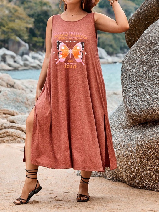 The rust-orange color and bold graphic make it a standout piece for summer festivals, outdoor concerts, or casual weekend adventures. The side slits add a flirty touch, while the relaxed fit ensures maximum comfort. Pair it with chunky jewelry and platform sandals for a look that’s equal parts nostalgic and modern.