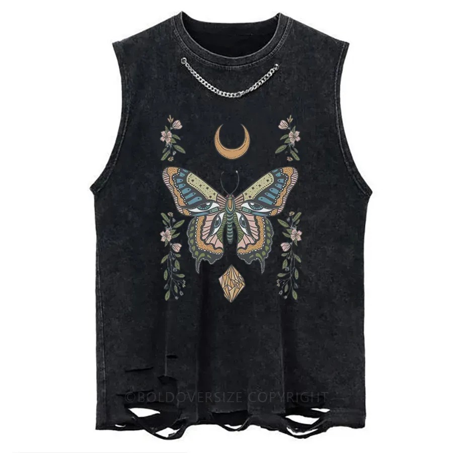 This tank is a masterpiece of boho-chic elegance. The intricate butterfly design, crescent moon, and floral details give it a mystical, vintage vibe. The distressed black fabric and chain detail add a touch of rocker edge.